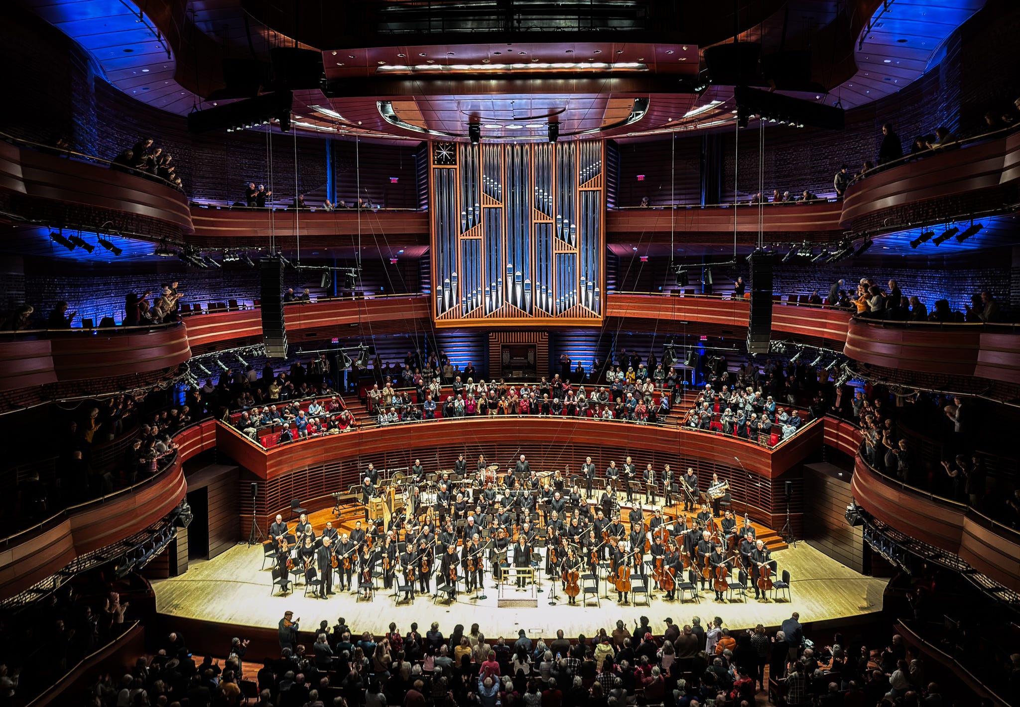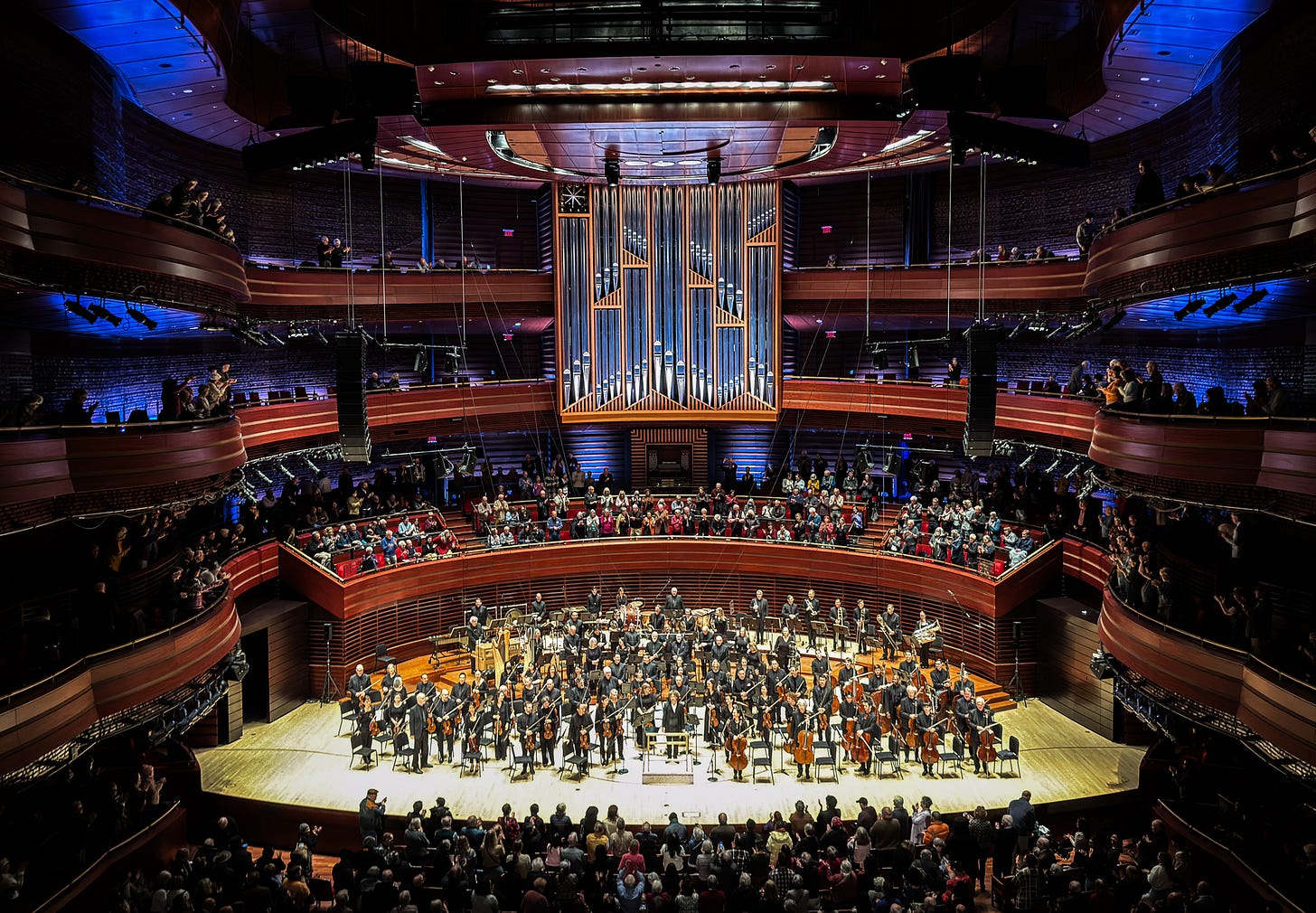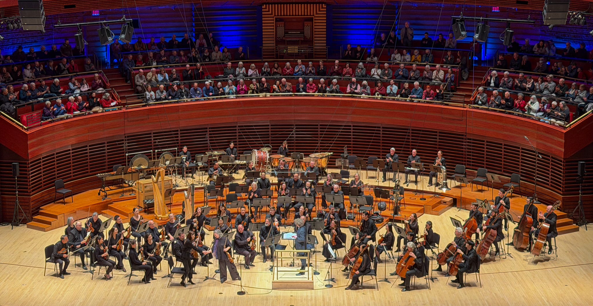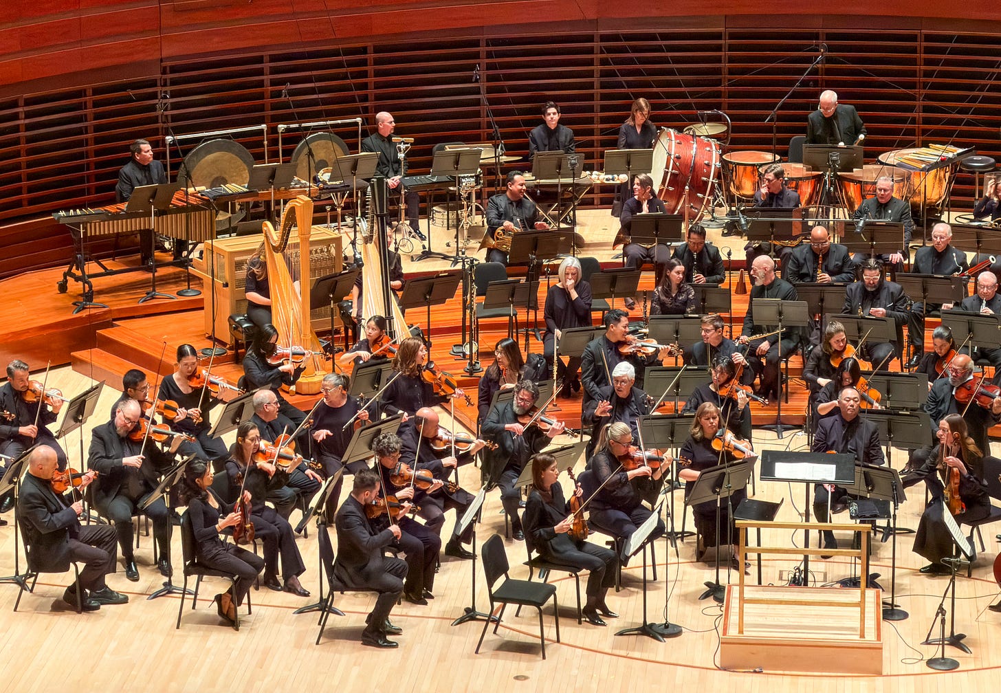 The program included Tchaikovsky’s Capriccio italien, Opus 45, followed by Prokofiev’s Violin Concerto No. 1 in D Major, Opus 19, featuring Hilary Hahn, a violinist long on my bucket list to see live. The sounds she can coax out of that violin are truly breathtaking, and this concerto highlighted all of her talents. It was also very cool to see the orchestra change size and shape from the first piece to the second (compare the picture above with the one below).